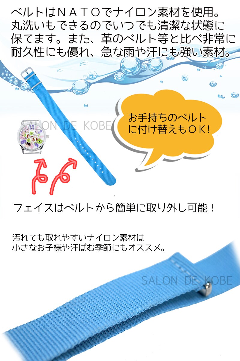 ストーリーにまとめられているかわいいツムツムの腕時計に、裏面には世界にひとつのシリアルナンバーを入れました。お子様にも大人気の、取り外し可能のベルトのNATOタイプを採用していますので、汚れたら取り外して、ベルトだけを洗濯して頂けます。