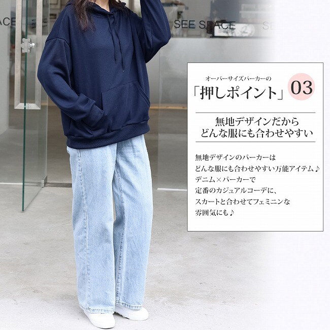 ・無地デザインのパーカーはどんな服にも合わせやすい万能アイテム♪デニム×パーカーで定番のカジュアルコーデに、スカートと合わせてフェミニンな雰囲気にも♪