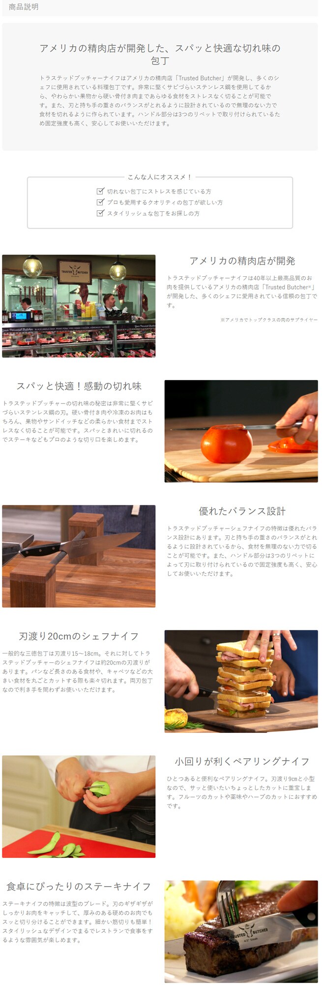 トラステッドブッチャーナイフ 特別セット | 堅くサビづらいステンレス鋼を使用!スパッと快適な切れ味が特徴のお料理包丁3種類4本セット