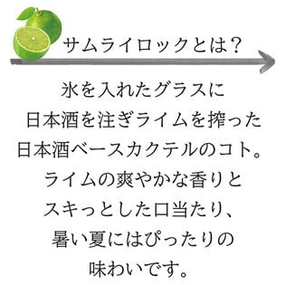 氷を入れたグラスに注ぐだけでライムの酸味がきいた爽やかな味わいのサムライロックができあがります。
