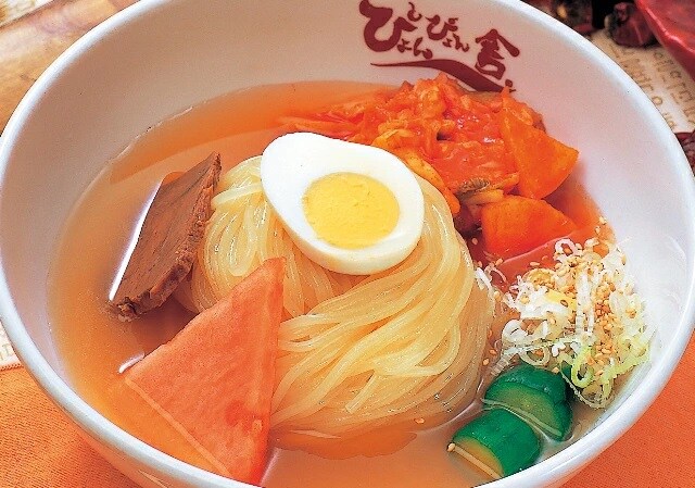 冷麺とは、基本的には焼肉店で供され、初めて食べた人が必ず「ゴムひも食べてるみたい・・・」と言う、 片栗粉と小麦粉からなる半透明で弾力のある麺が特徴です。