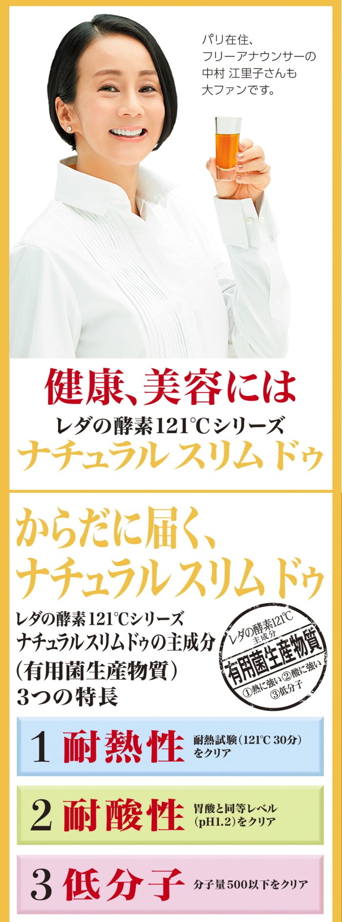 今回のレダの酵素121℃ ナチュラルスリムドゥは、菌を培養した酵素であり、培養の過程で酵素のデメリットである「熱に強く」「酸に強く」「低分子」になる様、培養されているので、酵素のデメリットを解消した酵素ドリンクです。
