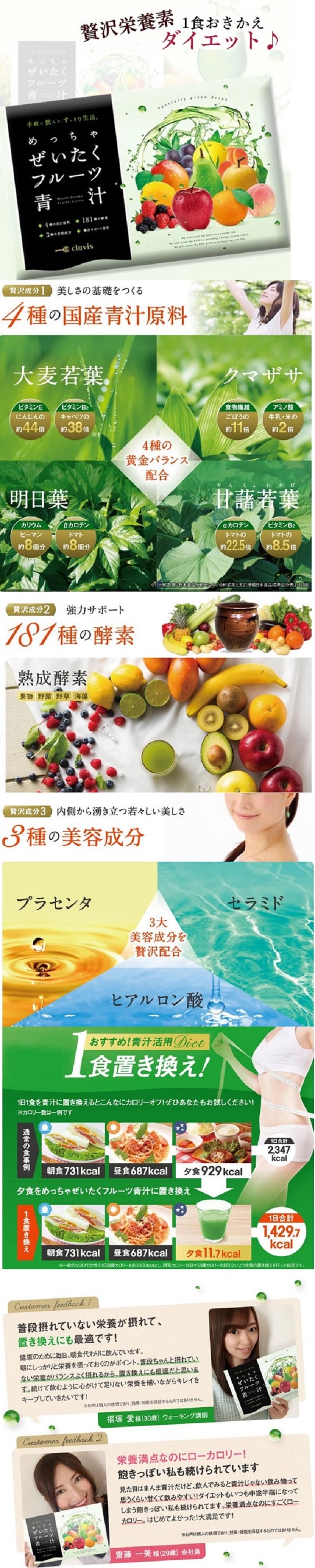 還元麦芽糖水飴、大麦若葉粉末、クマザサ粉末、明日葉粉末、いちご果汁パウダー、マンゴー果汁パウダー、 植物発酵物乾燥粉末、パン酵母(亜鉛、マンガン、銅、ヨウ素、セレン、クロム、モリブデン含有)、抹茶、豆乳末、有胞子性乳酸菌、メロンプラセンタ(胎座)抽出物、フルーツ野菜エキス、茶抽出物、ターミナリアベリリカ抽出物、甘藷若葉粉末、大豆胚芽抽出物、パイナップル果実抽出物/シクロデキストリン、甘味料(スクラロース、ネオテーム)、香料、ビタミンC、ヒアルロン酸、ビタミンE、ナイアシン、パントテン酸Ca、ビタミンB6、ビタミンB2、ビタミンA、葉酸、ビタミンD、ビタミンB12、