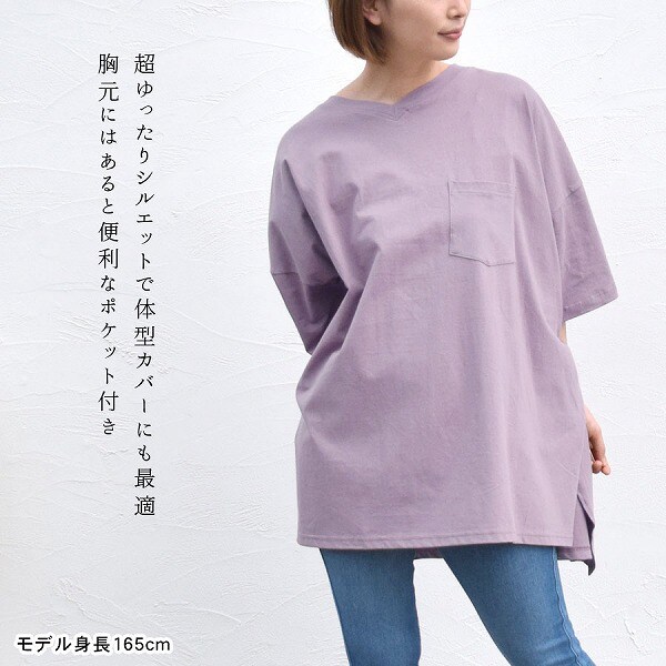 選べる丸首orV首前後丈違いゆったりBIGTシャツカットソー | 超ゆったりシルエットで体型カバーにも最適★