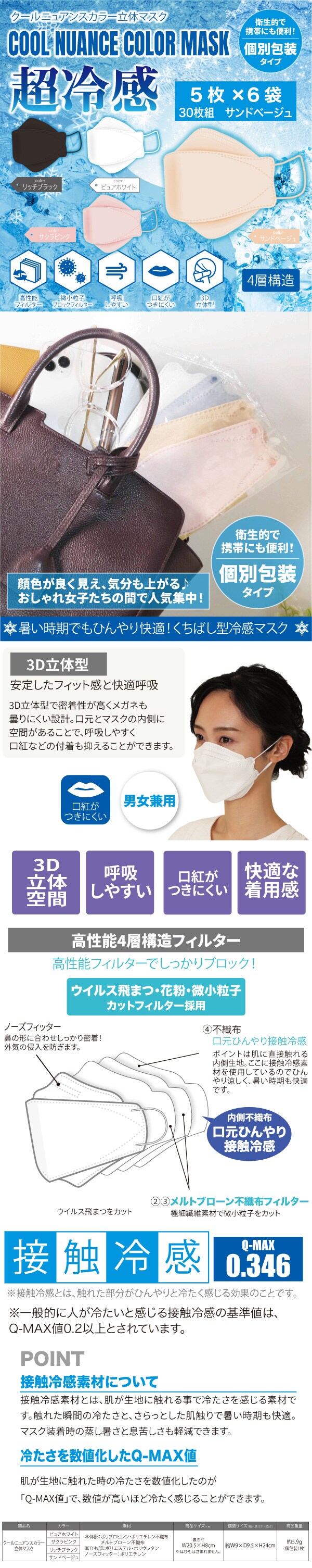 【5枚入り×6袋/サンドベージュ】クールニュアンス立体マスク同色30枚組 | 【マスク工業会会員】暑い時期でもひんやり快適!くちばし型冷感マスク