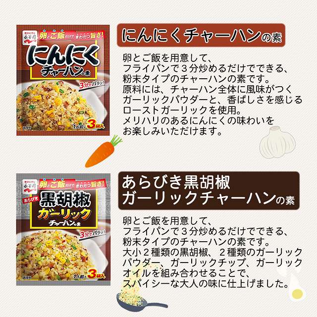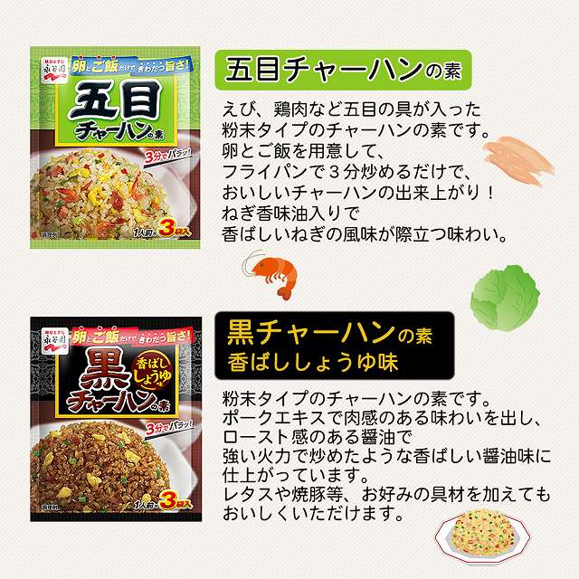 卵とご飯を用意して、フライパンで3分炒めるだけで、パラっとしたおいしいチャーハンの出来上がり、人気の永谷園のチャーハンの素6種類からお選びいただけます。