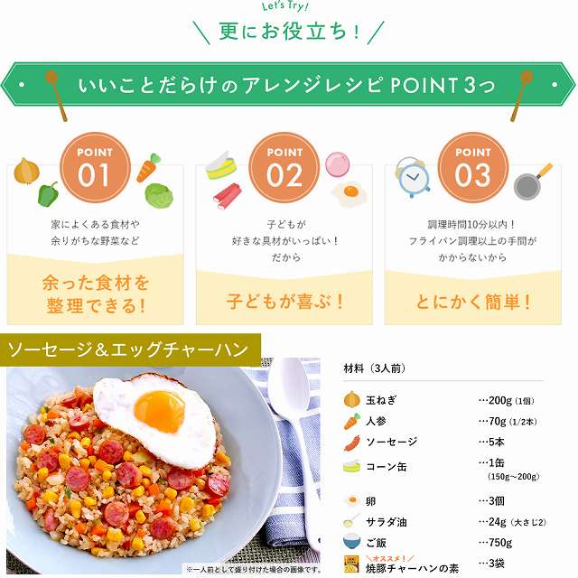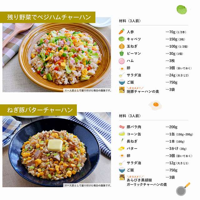 ・お召し上がり方:卵とご飯を用意して、フライパンで3分炒めるだけで、パラっとしたおいしいチャーハンの出来上がり
