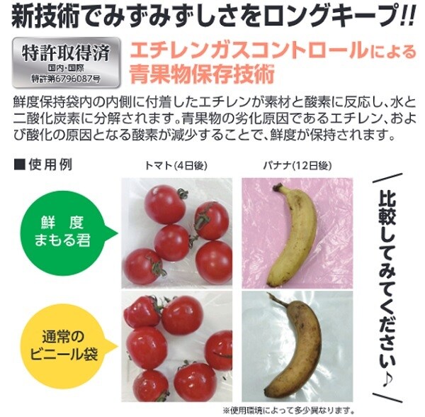 特許技術の素材が袋内に存在する細菌やカビを減菌し、さらに青果物の表面に付着している