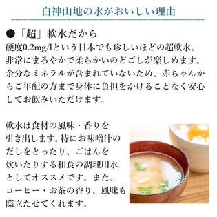 また、「超」軟水・pH6.6の弱酸性の水質はそのまま飲料水として利用するほか、素材を際立たせ、コーヒー、紅茶、水割り、ご飯、お料理をより一層おいしくします。あなたの日常に、白神の湧き水を是非。