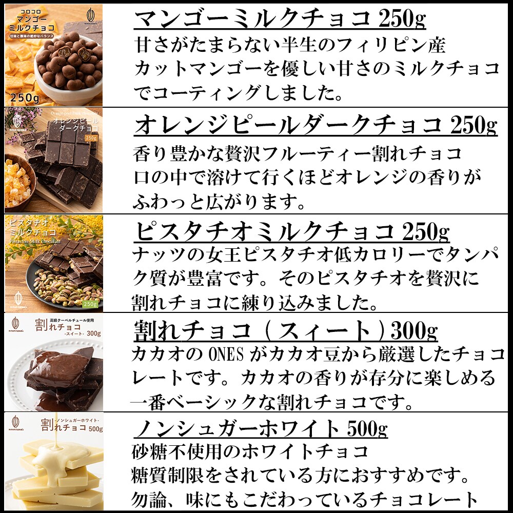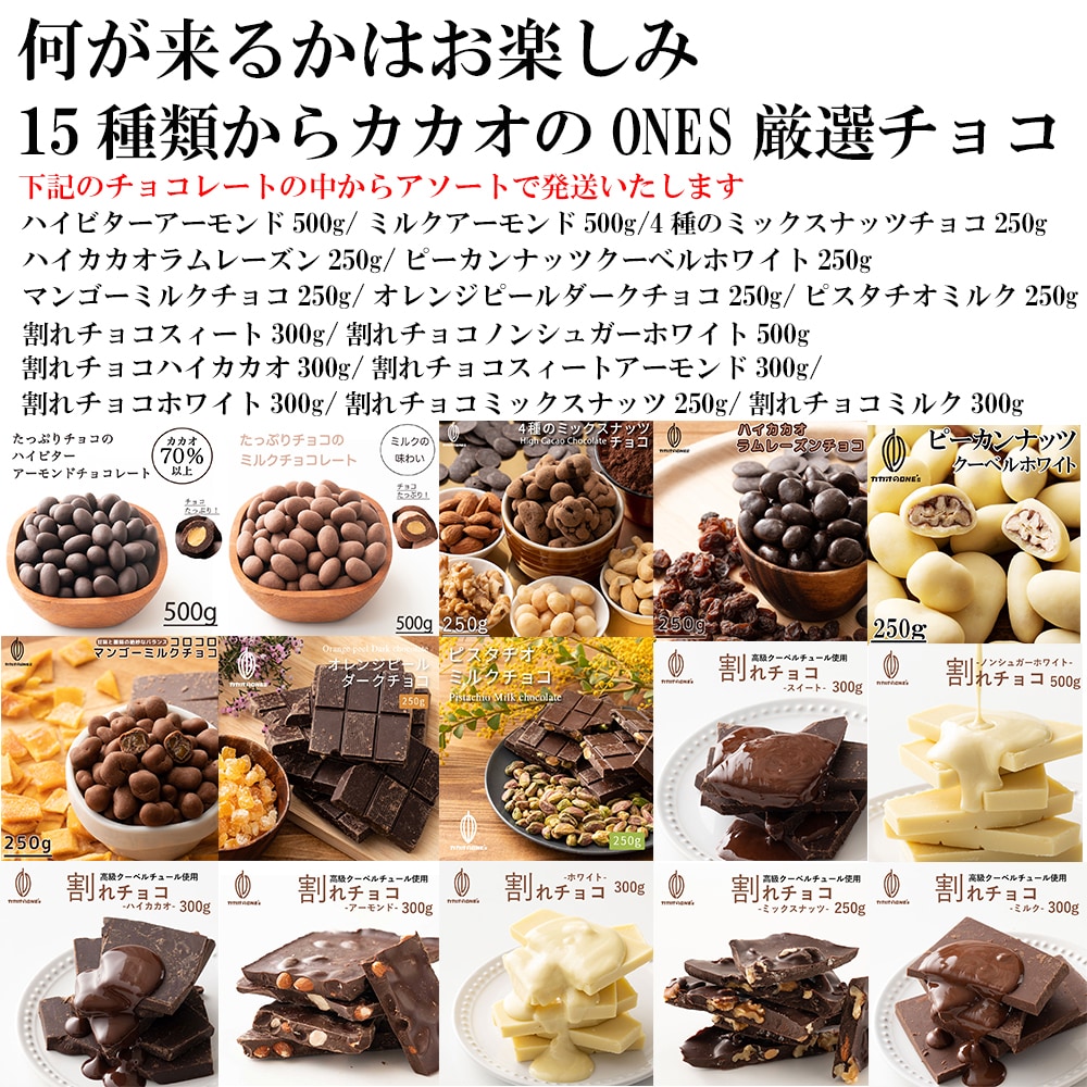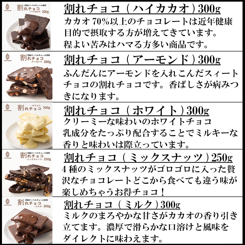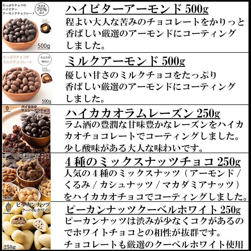 ハイビターアーモンド500g/ミルクアーモンド500g/4種のミックスナッツハイカカオ250g/ハイカカオラムレーズン250g/ピーカンナッツクーベルホワイト250g/マンゴーミルクチョコ250g/オレンジピールダークチョコ250g/ピスタチオミルク250g/割れチョコスィート300g/割れチョコノンシュガーホワイト500g/割れチョコハイカカオ300g/割れチョコスィートアーモンド300g/割れチョコホワイト300g/割れチョコミックスナッツ250g/割れミルク300g