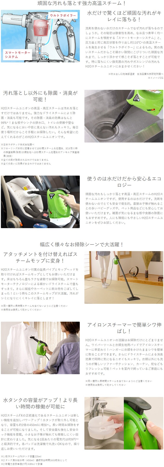 H2Oスチームユニオンはパワフルでコンパクトなスチームクリーナーです。高温・高圧ドライスチームによって頑固な油汚れも浮かせてしっかり落とします。強力なスチームの力で除菌・消臭も可能。その除菌率は驚きの99%※!目に見えない汚れや臭いまでスッキリキレイに。さらに延長パイプとモップヘッドに付け替えればスチームモップに大変身!床や畳もラクラクお掃除ができます。お掃除以外にアイロンスチーマーとして使用も可能!シワを伸ばしながらにおいもリフレッシュ!洗剤不要なのでお子様のいるご家庭でも安心してお使いいただけます。H2Oスチームユニオンで家中丸ごと大掃除!