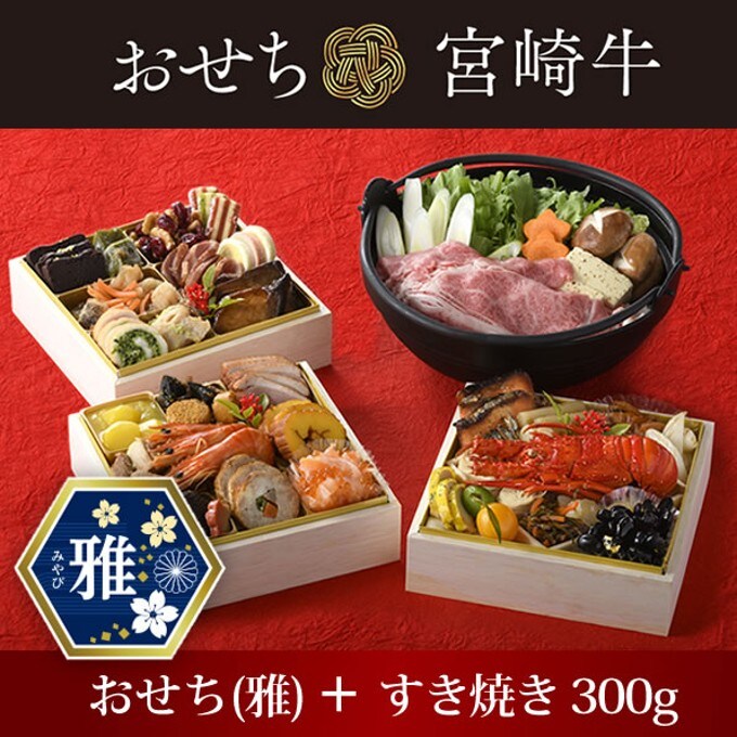 【12/30午前着】芳々亭監修【雅(3-4人前)】おせち(全41種)+宮崎牛すき焼き300g | 家族が楽しめるおせちを追求 おせちが苦手な方でも鍋とセットだからみんなで一緒に楽しめます。