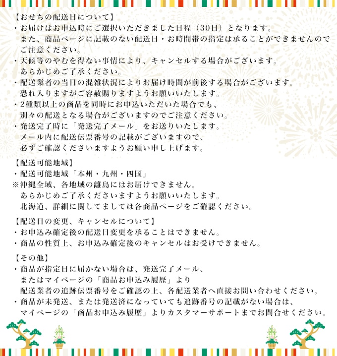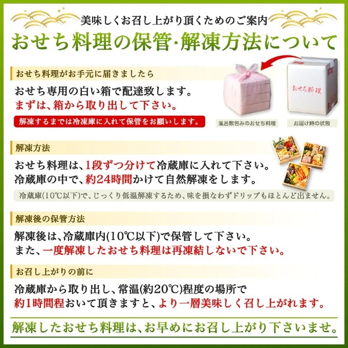 ※保管方法:一度解凍したおせち料理は再び凍らせますと品質が変わりますので、再凍結はお避けください。