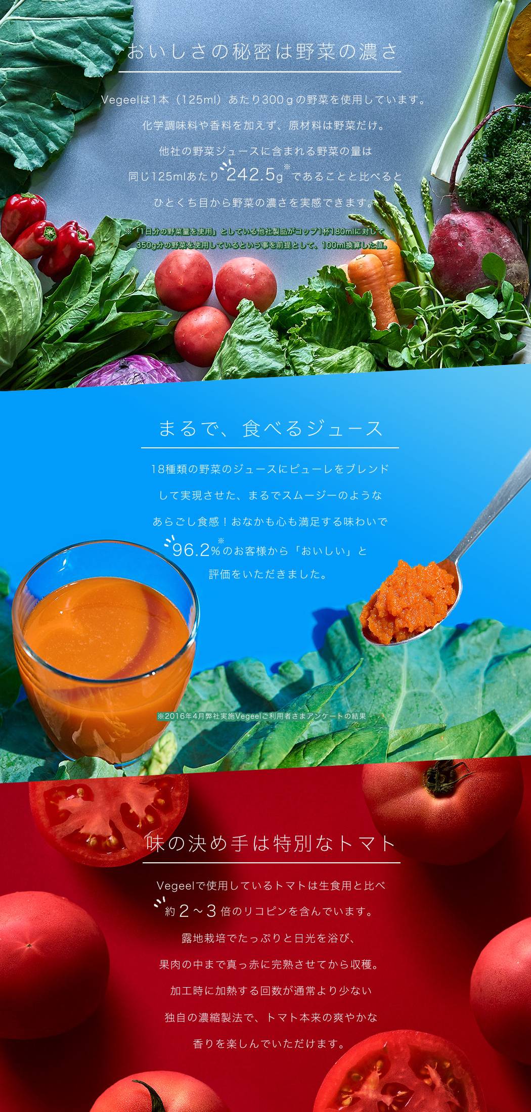 トマトやにんじんを中心に、18種類の野菜300gをギュッと125mlに詰めこみました。野菜の使用量は300g(10%増※当社比)、種類も18種類(スーパーベジタブル※(高リコピントマト、赤ピーマン、紫キャベツ、メキャベツ(プチヴェール))を5%配合)に増え、パワーアップ!野菜をそのまますりつぶしたようなあらごし食感が楽しめる、オイシックスオリジナルの野菜ジュースです。野菜の栄養を大切に、食塩・香料・保存料無添加、栄養強化を目的とした添加物は一切使用していません。 ※スーパーベジタブル:野菜の中でも、野菜に期待される成分の量などに特長があるもの