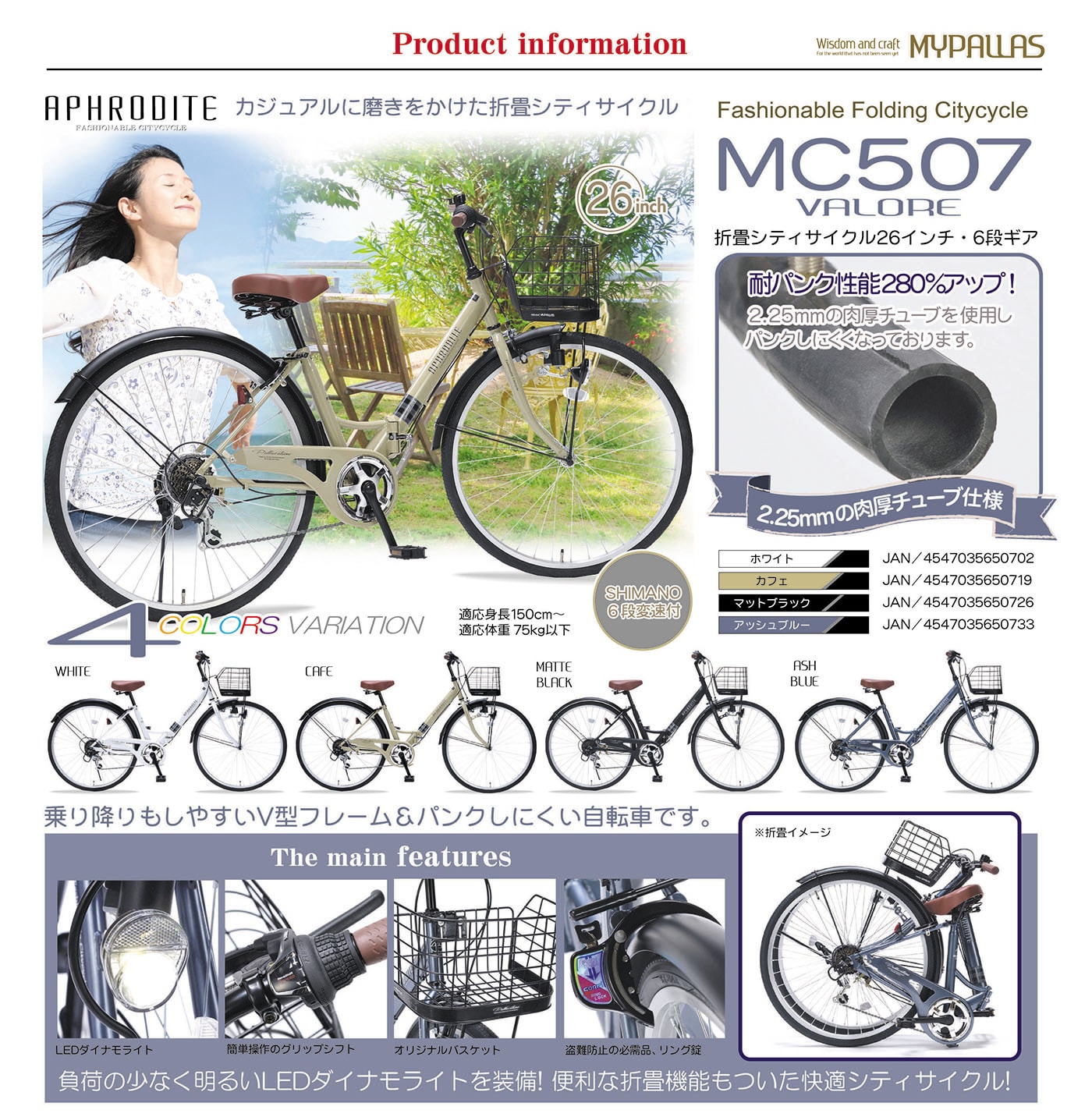 【カフェ】折畳シティサイクル26インチ・6段ギア・ダイナモLEDライト・肉厚チューブ | 肉厚チューブ仕様でパンクしにくい6段変速付折畳シティサイクル!