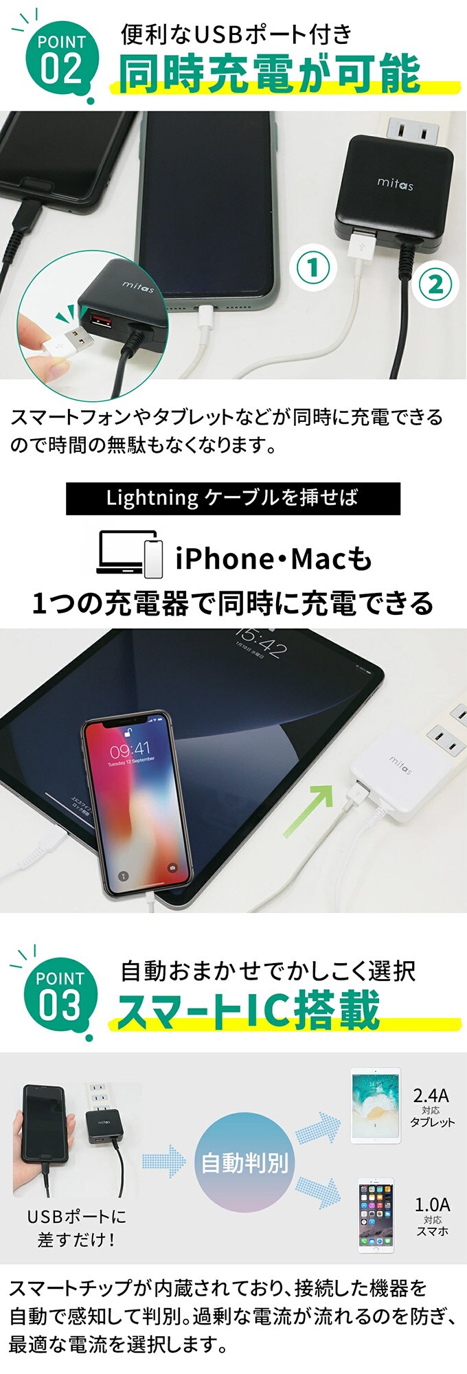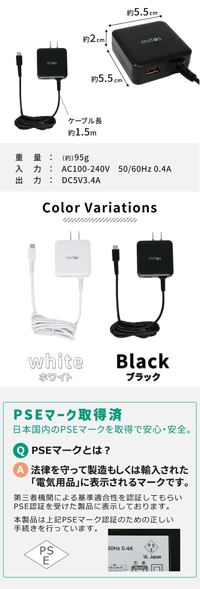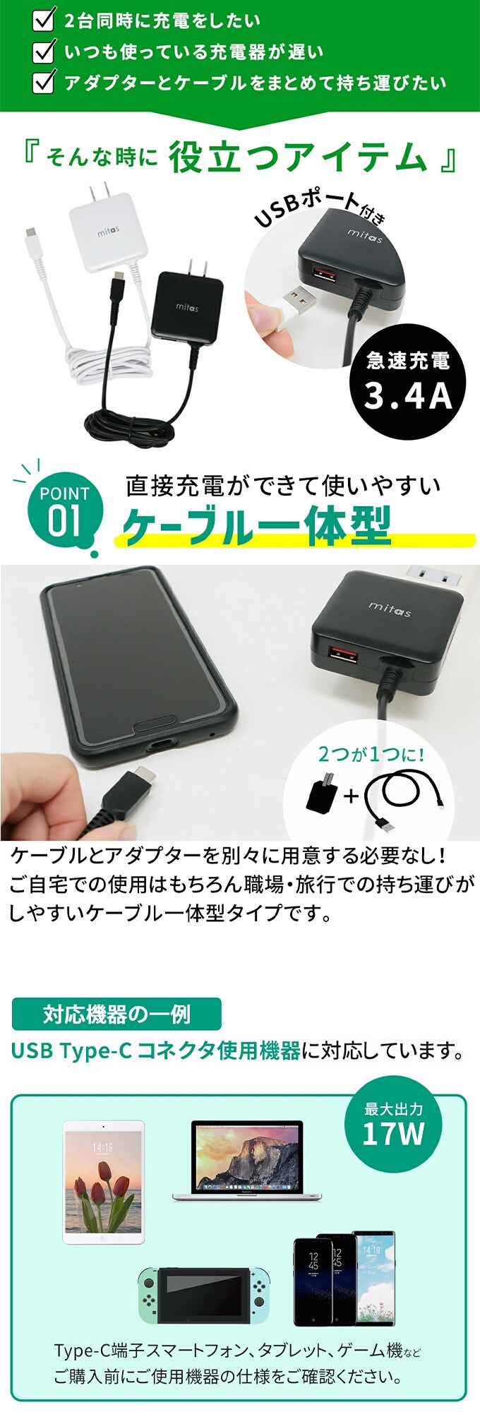 Type-C+USB 一体型 ACアダプタ (ブラック) | USBType-Cケーブルが一体になった、計3.4A高出力の充電器。USBポートも搭載