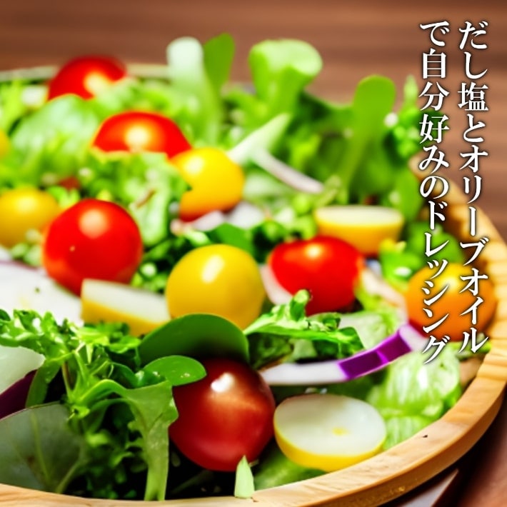 サラダには、オリーブオイルと万能調味塩を混ぜるだけで、ヘルシーなドレッシングが簡単にできます。