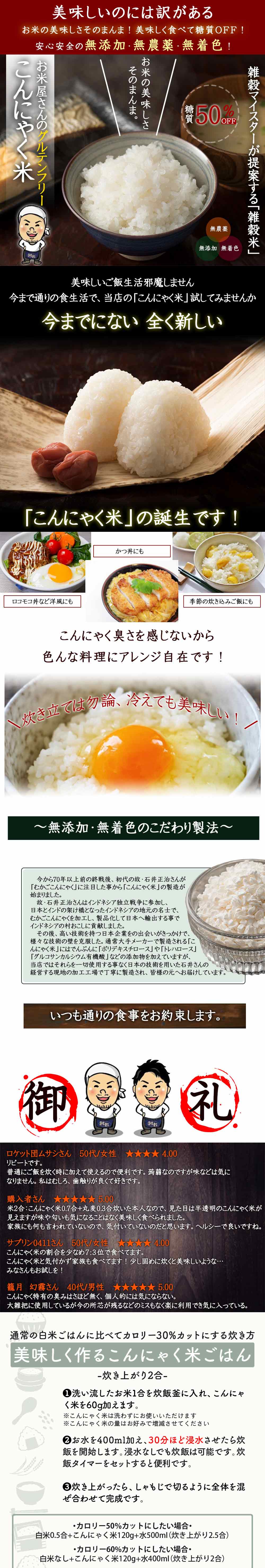 *カロリー50%カットにしたい場合… 白米0.5合+こんにゃく米120g+水500ml(炊き上がり2.5合)