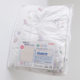 ポリエステル100%の生地と比べて吸放湿性がある、呼吸する肌掛けふとんです。