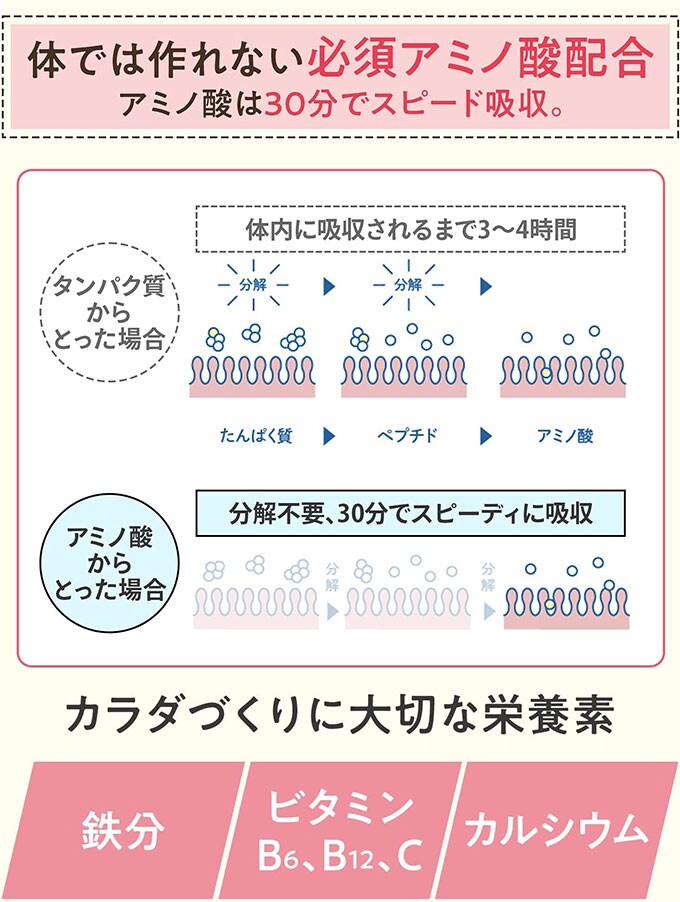 ・原材料/材質/素材:粉末状大豆たん白(国内製造)、コラーゲンペプチド(ゼラチンを含む)/ロイシン、リジン、バリン、イソロイシン、スレオニン、フェニルアラニン、クエン酸(Na)、乳酸Ca、ショ糖脂肪酸エステル、メチオニン、ヒスチジン、甘味料(アスパルテーム・L-フェニルアラニン化合物、アセスルファムK)、トリプトファン、レシチン、ピロリン酸鉄、着色料(アカキャベツ色素)、V.C、ナイアシン、香料、パントテン酸Ca、V.B6、V.B1、V.B2、V.A、V.D、V.B12