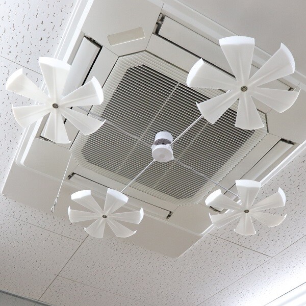 取付ファンが回転することで、これまでのようにエアコン付近の方に直接風があたるのを防ぎます。