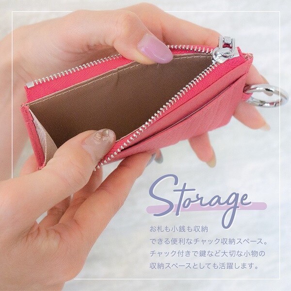 [パステルピンク] ミニウォレット | お札や小銭をチャックで収納!7つのカード用ポケット付き!便利なリングで引っかけ簡単です。