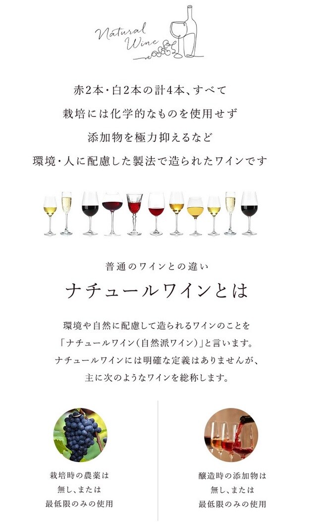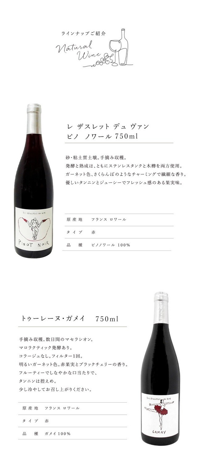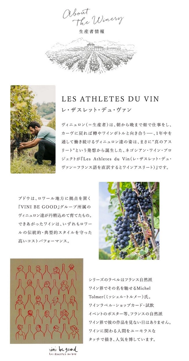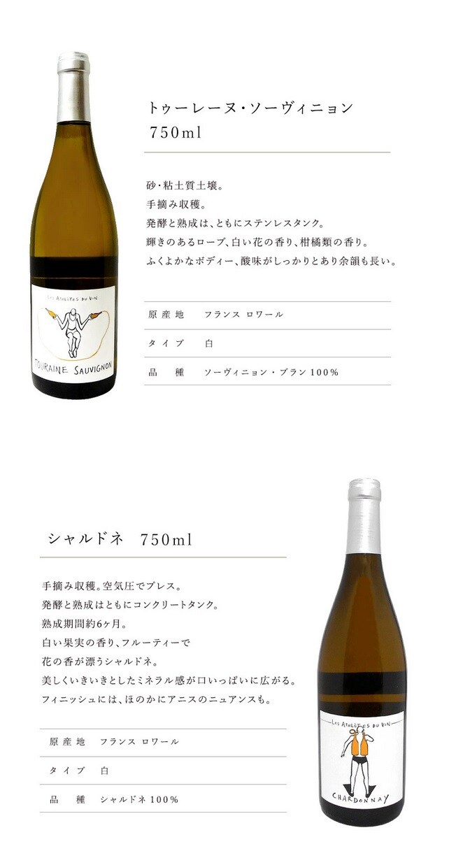 フランス ロワールに拠点を置く、自然派ワインに力を注ぐワイナリー、レ・ザスレット・デュ・ヴァンによる栽培に化学的なものを使用せず、添加物も極力抑え、環境・人に配慮した製法で造られたワイン4本セットでお届けします。1年中働くワイナリーを「アスリート」に例えたラベルデザインも目を惹きます。バスケットボール、バレエ、なわとび、水泳をイメージしたラベルが何とも楽しいデザイン。飲み口も優しく、自然派ワインの入門にぴったりのセット内容です。