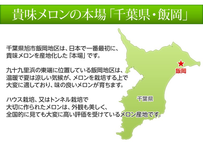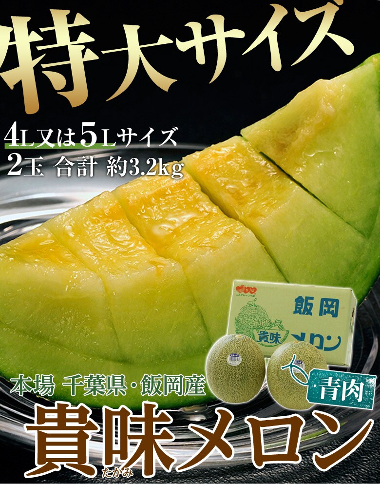 【計約3.2kg 4L〜5Lサイズ×2玉】『貴味メロン(青肉)』千葉県飯岡産 | 高い評価を受けているメロン産地、飯岡産!