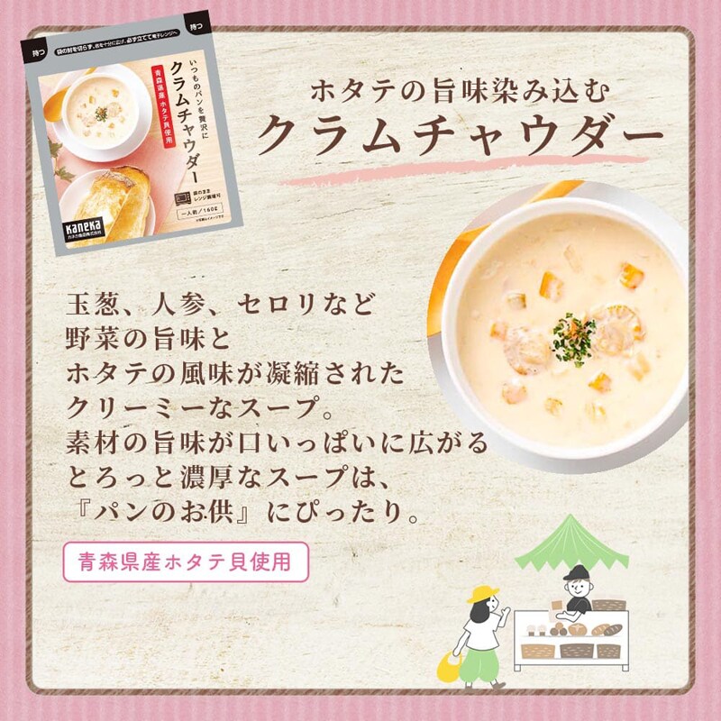 [4袋セット] カネカ食品/クラムチャウダー(※賞味期限:2024年5月22日) | 濃厚ミルク感たっぷり!青森県産ホタテ貝の旨味がスープにとろけて濃厚、口いっぱいに広がる!