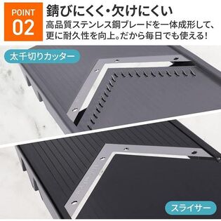 ●V字刃が食材をスライスする時の抵抗を効率よく分散。千切りもみじんキリもスパスパ快適。