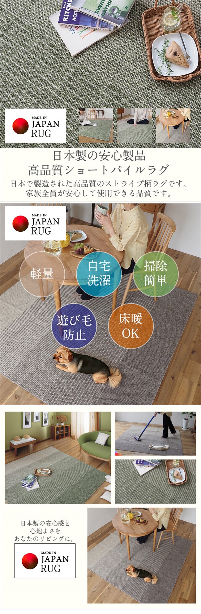 このラグは、日本で製造された高品質のストライプ柄ラグです。家族全員が安心して使用できる品質を持っています。特に、遊び毛が少ないため、お掃除も手間がかかりません。