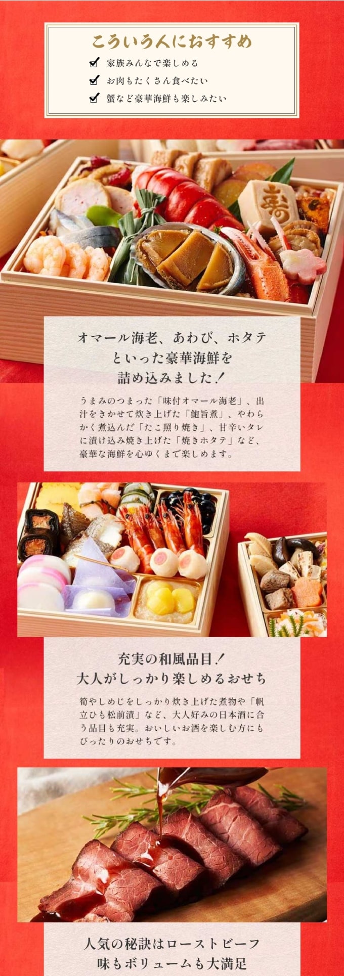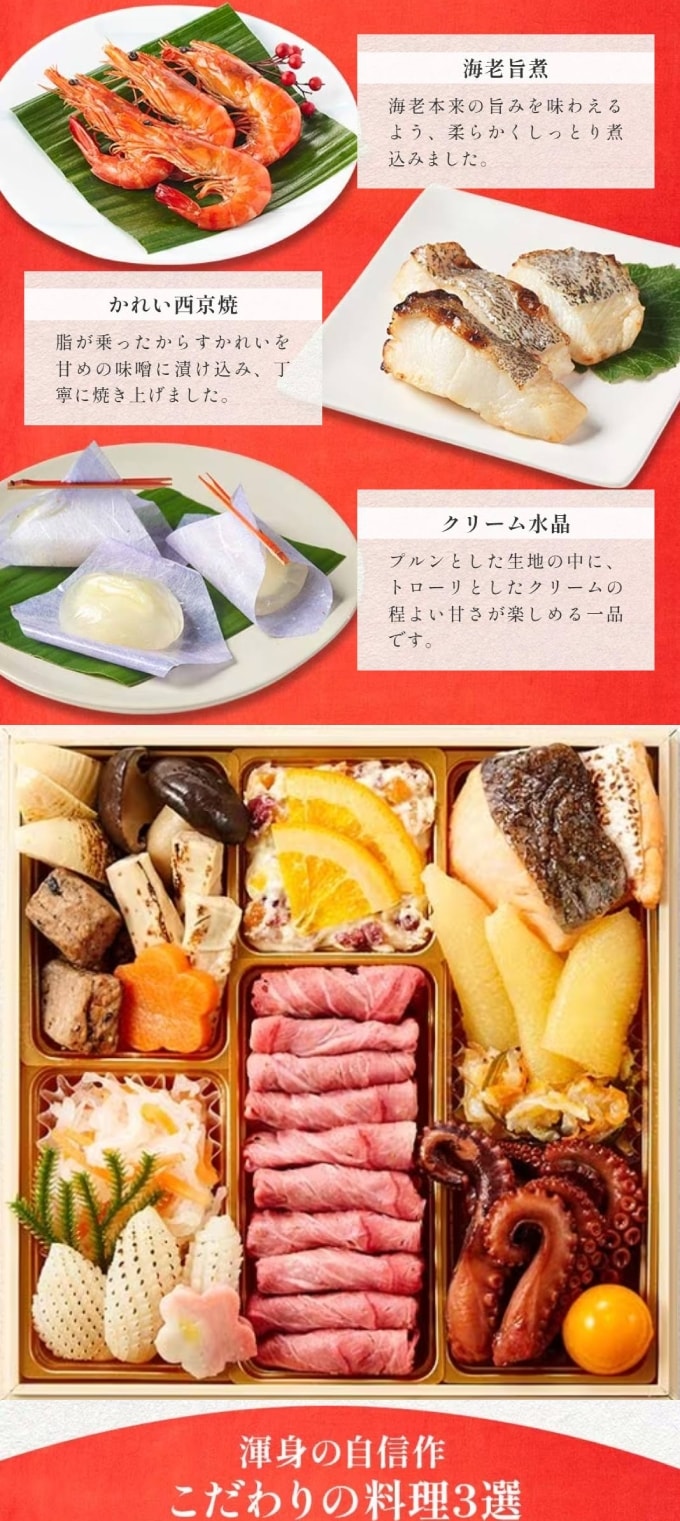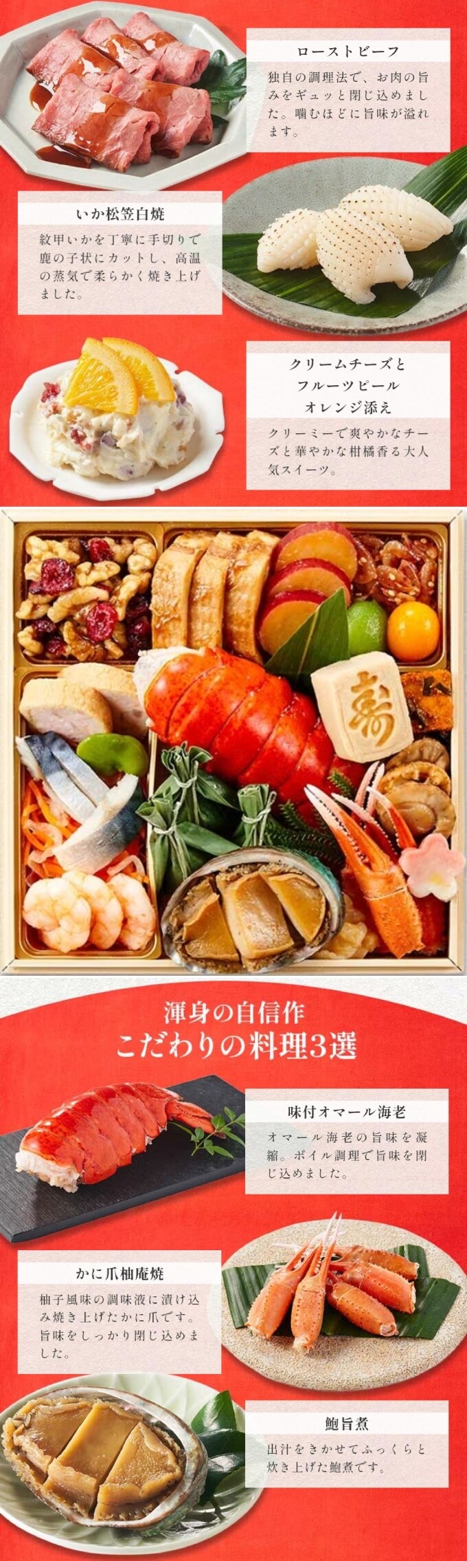 伊達巻,鯛広島菜巻,紅白海老結び,紅鮭昆布巻,カレイ西京焼,市松蒲鉾,クリーム水晶,海老旨煮,日の出きぬた巻,黒豆煮金粉飾り,栗きんとん,味付焼筍,本しめじ旨煮,豚の炭火焼,味付巻湯葉,梅人参旨煮,紅白なます,いか松笠白焼,梅麩甘露煮,クリームチーズとフルーツピール オレンジ添え,ローストビーフ,銀鮭の粕漬焼,帆立ひも松前漬,味付数の子,蛸照り焼き,きんかんさわやか煮,クランベリークルミ,海老信田巻,塩空豆,〆サバ,キャロットオニオンサラダ,焼えび,豚の角煮風,さつまいもレモン煮,桜えび佃煮,若桃甘露煮,味付オマール海老,こしあん入り麩饅頭,鮑煮,味付寿高野,真だら子の旨煮,焼帆立,柚子くらげ,かに爪柚庵焼