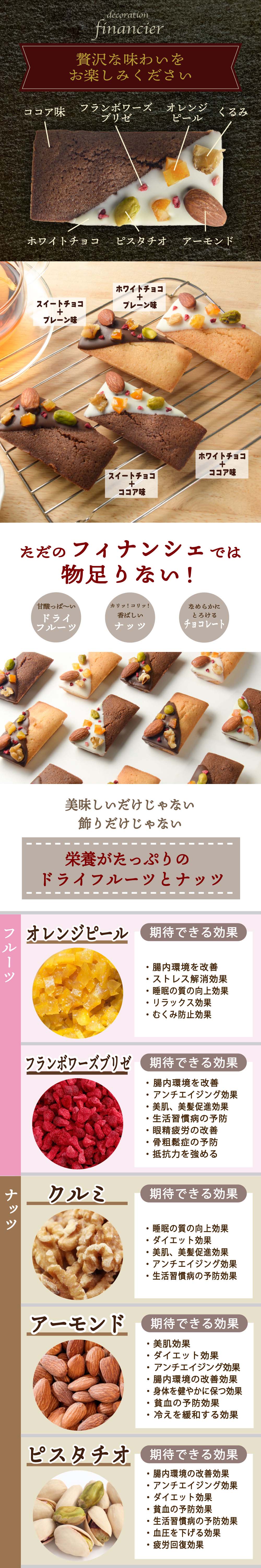 原材料名 卵(国産)、砂糖、アーモンドプードル、バター、チョコレート(砂糖、植物油脂、ココアパウダー、カカオマス)、米粉、アーモンド、ココア、オレンジピール(オレンジピール、ぶどう糖果糖液糖、砂糖)、ピスタチオ、くるみ、乾燥フランボワーズ/乳化剤、香料、漂白剤(亜硫酸塩)、(一部に卵・乳成分・くるみ・大豆・アーモンド・オレンジを含む)