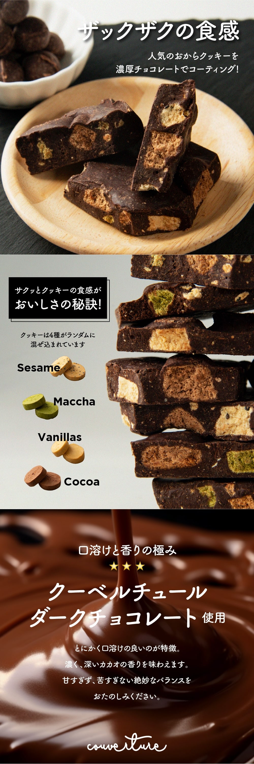 ・原材料/材質/素材:チョコレート(カカオマス、砂糖、ココアバター)(国内製造)、おからクッキー(米粉、バター、はちみつ、おからパウダー、ごま、ココアパウダー、抹茶)/乳化剤、香料、(一部に乳成分・ごま・大豆を含む)