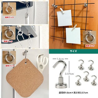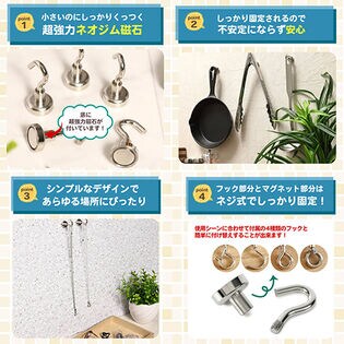 シンプルデザインのマグネットフック5個セットに加え、さらに丸型、引っ掛け、フック大きめタイプなど4種類のフックが付いたセット商品です。