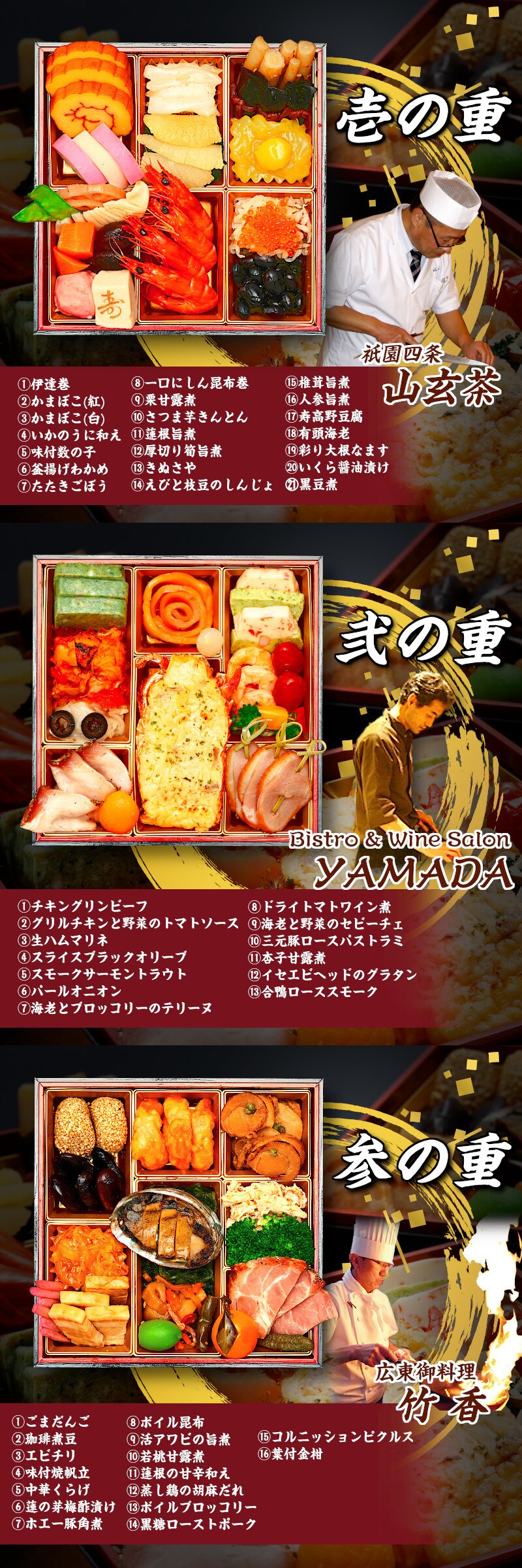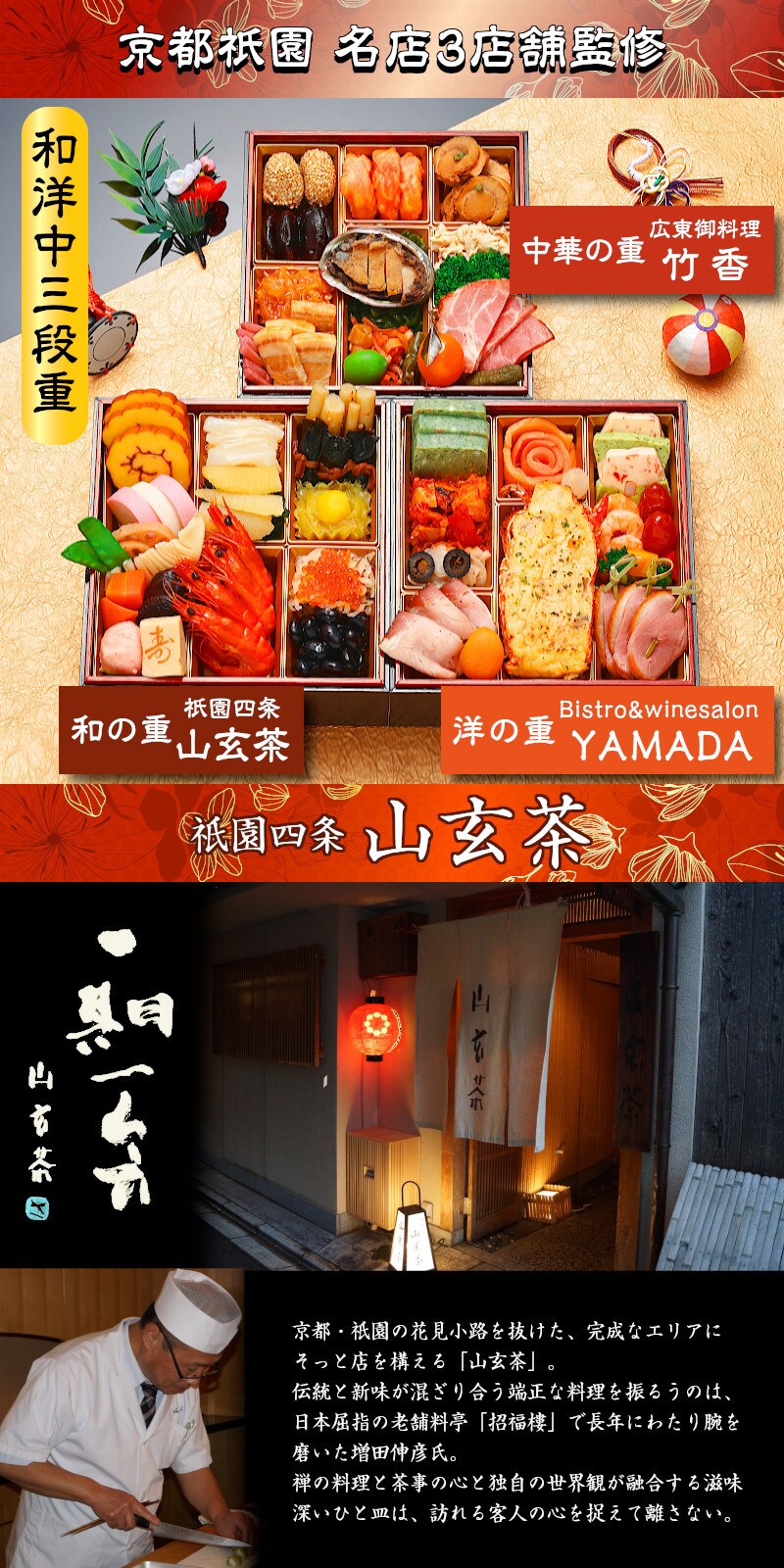 - 京都祇園3店舗監修/50品/約3~4人前/和洋中三段重