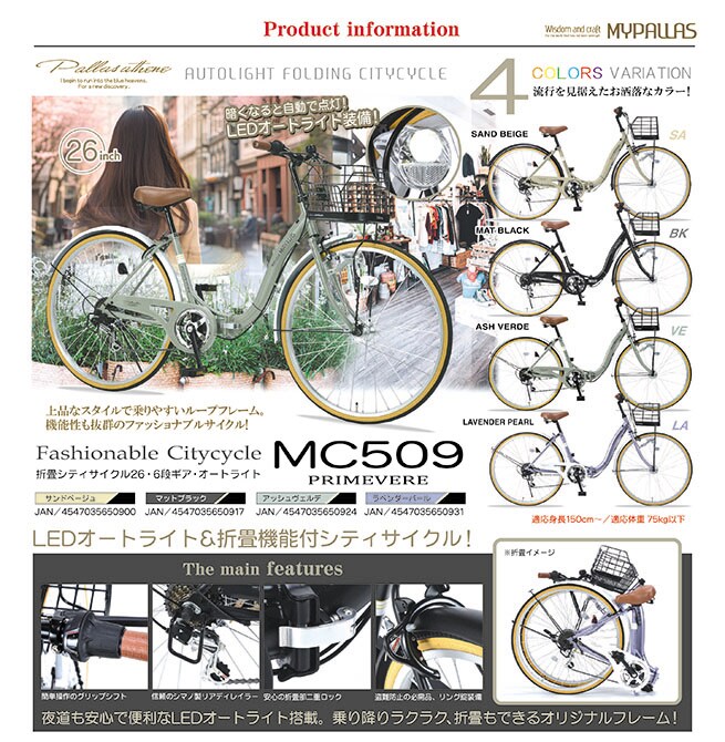 【マットブラック】折畳シティサイクル26インチ・6段ギア・オートライト | 上品なスタイルで乗りやすいループフレーム。機能性も抜群のファッショナブルサイクル!