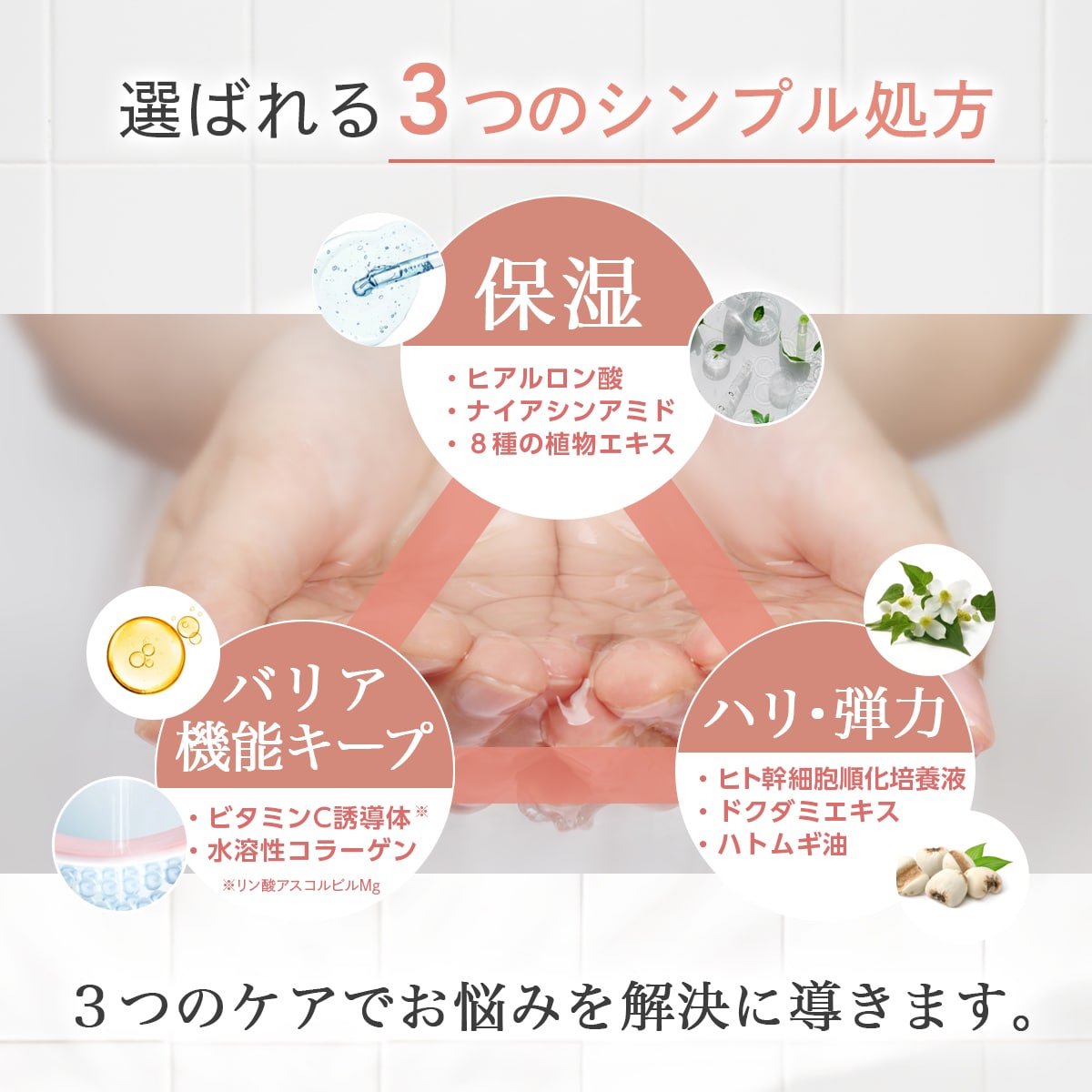 水、グリセリン、DPG、ヒアルロン酸Na、水溶性コラーゲン、リン酸アスコルビルMg、ヒト幹細胞順化培養液、ナイアシンアミド、プラセンタエキス、ドクダミエキス、ハトムギ油、セイヨウトチノキ種子エキス、アルニカ花エキス、ハマメリス葉エキス、セイヨウキズタ葉/茎エキス、セイヨウオトギリソウ花/葉/茎エキス、ブドウ葉エキス、ポリアクリル酸Na、クエン酸、キサンタンガム、1.2-ヘキサンジオール、BG、フェノキシエタノール、メチルパラベン、プロピルパラベン