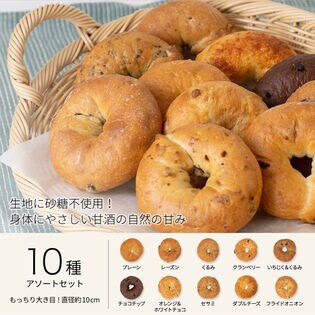 - 10種類のベーグルアソート (プレーン、レーズン、くるみ、チョコチップ、クランベリー、いちじく&くるみ、オレンジ&ホワイトチョコ、セサミ、Wチーズ、フライドオニオン×各1個ずつ 10種計10個)
