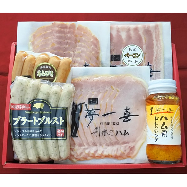 【5種(計489g)+ドレッシング付き】「夢一喜」 熟成ハム・ウインナー詰合せ | ロースハム・ボンレスハム・ベーコン(スライス)、ウインナー、ブラートブルスト
