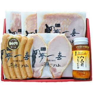 - ロースハムステーキ150g、ロースハムスライス79g、ボンレスハムスライス80g、ベーコンスライス80g、あらびきウインナー130g、ハム用ドレッシング140ml