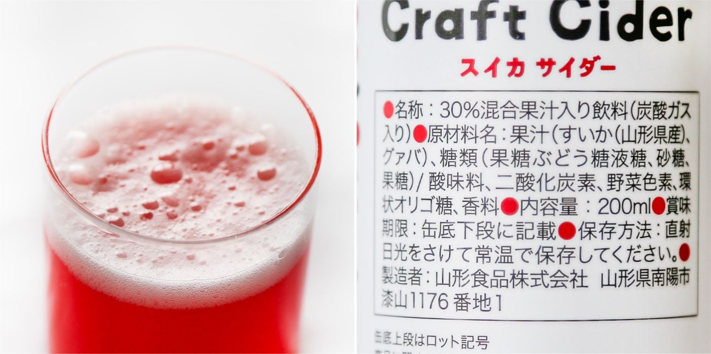 ・原材料/材質/素材:果汁(すいか(山形県産)、グァバ)、糖類(果糖ぶどう糖液糖、砂糖、果糖)/酸味料、二酸化炭素、野菜色素、環状オリゴ糖、香料