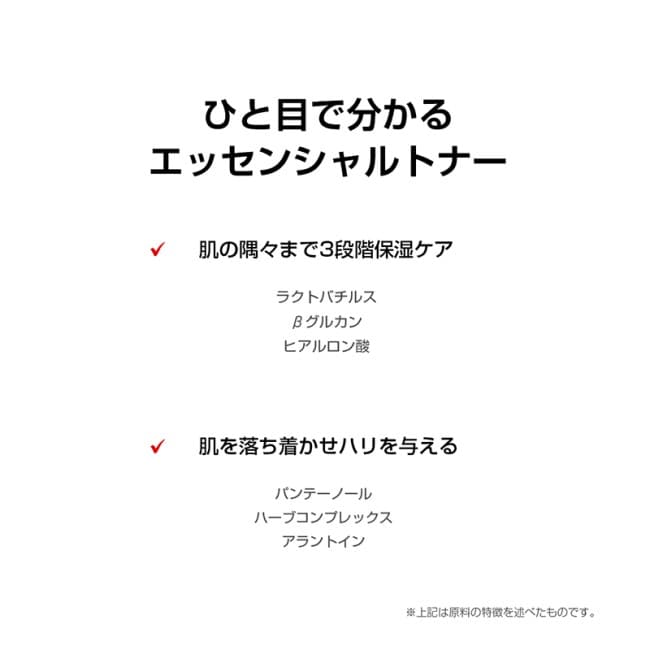 水、BG、DPG、グリセリン、1,2-ヘキサンジオール、乳酸桿菌発酵液、ベタイン、尿素、β-グルカン、フェノキシエタノール、PEG-32、アラントイン、パンテノール、カルボマ、ーTEA、コセス-7、PPG-1-PEG-9ラウリルグリコールエーテル、ラベンダー花エキス、サンシキスミレエキス、ヤグルマギク花エキス、アデノシン、PEG-40水添ヒマシ油、グリチルリチン酸2K、EDTA-2Na、ヒドロキシエチルセルロース、ヒアルロン酸Na、カミツレ花エキス、オプンチアツナ果実エキス、バクガエキス、カラタチ果実エキス、タチアオイ花エキス、アロエベラ葉エキス、ペンチレングリコール、カプリリルグリコール、エチルヘキシルグリセリン、香料
