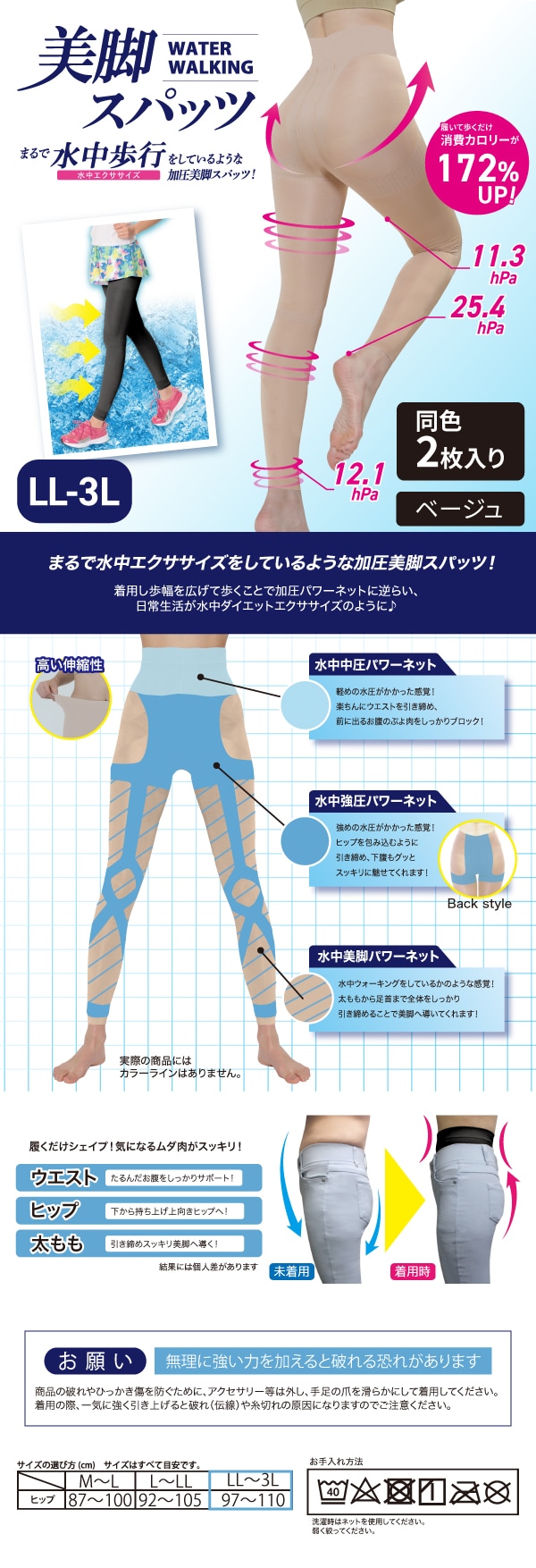 【LL-3L/ベージュ/2枚組】NEWウォーターウォーキング美脚スパッツ ロングタイプ同色2枚組 | まるで水中エクササイズをしているような美脚スパッツ!
