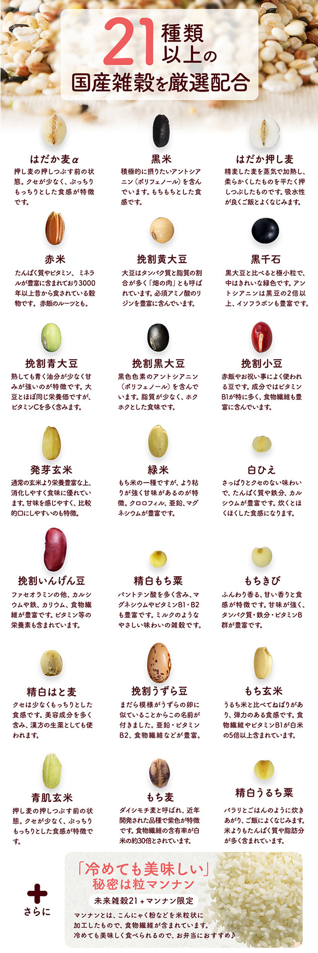 裸麦α(大麦(国産))、黒米、裸押し麦、もち麦、赤米、黄大豆(割り)、黒千石大豆、青大豆(割り)、黒大豆(割り)、青肌玄米、小豆(割り)、発芽玄米、緑米、米粒状こんにゃく加工食品、精白ひえ、インゲン豆(割り)、精白もち栗、精白もちきび、精白はと麦、精白うるち栗、うずら豆(割り)、発芽もち玄米/加工デンプン、グルコン酸Ca、増粘剤(アルギン酸Na)、調味料(有機酸)