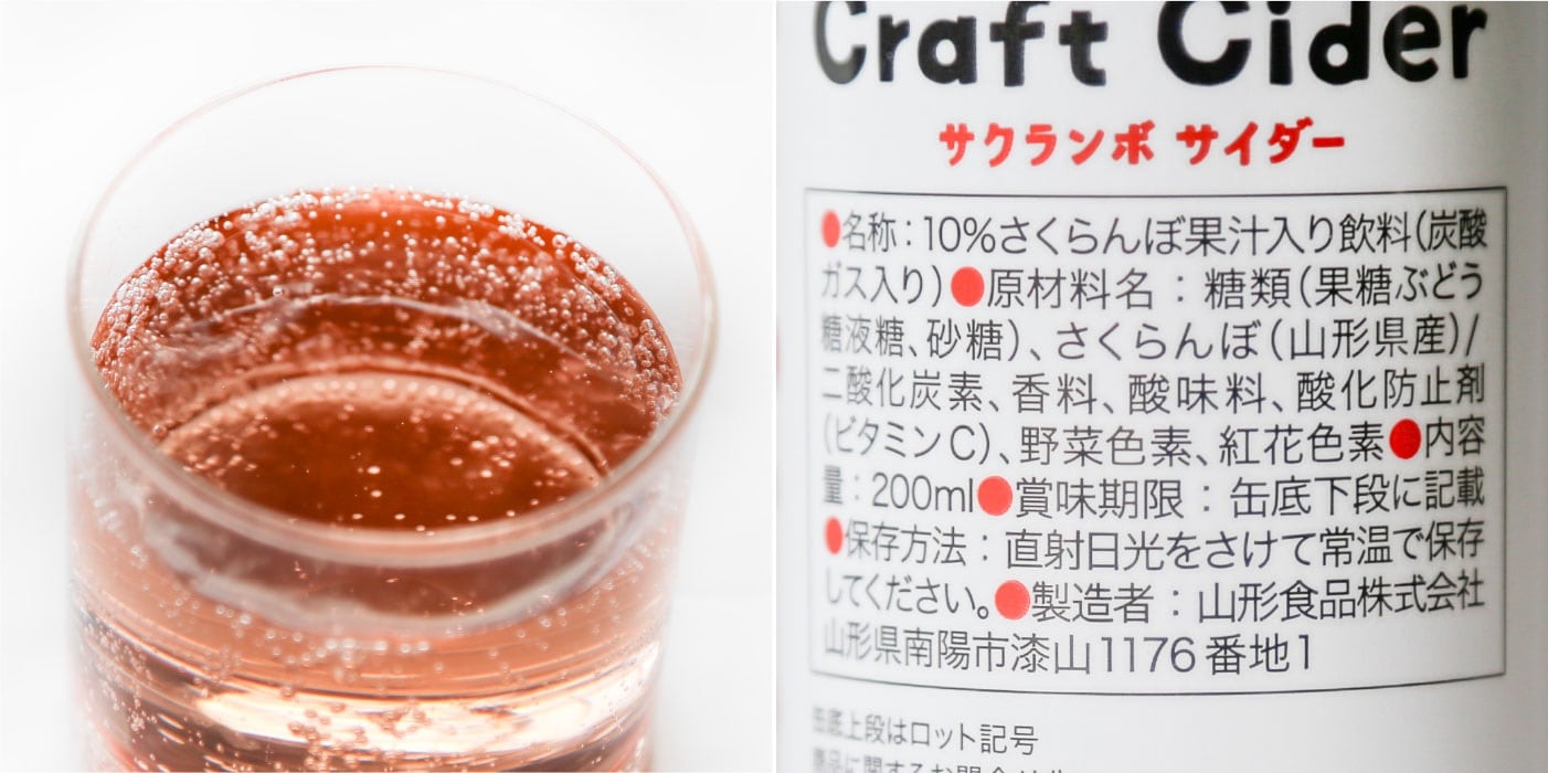 ・原材料/材質/素材:糖類(果糖ぶどう糖液糖、砂糖)、さくらんぼ(山形県産)/二酸化炭素、香料、酸味料、酸化防止剤(ビタミンC)、野菜色素、紅花色素