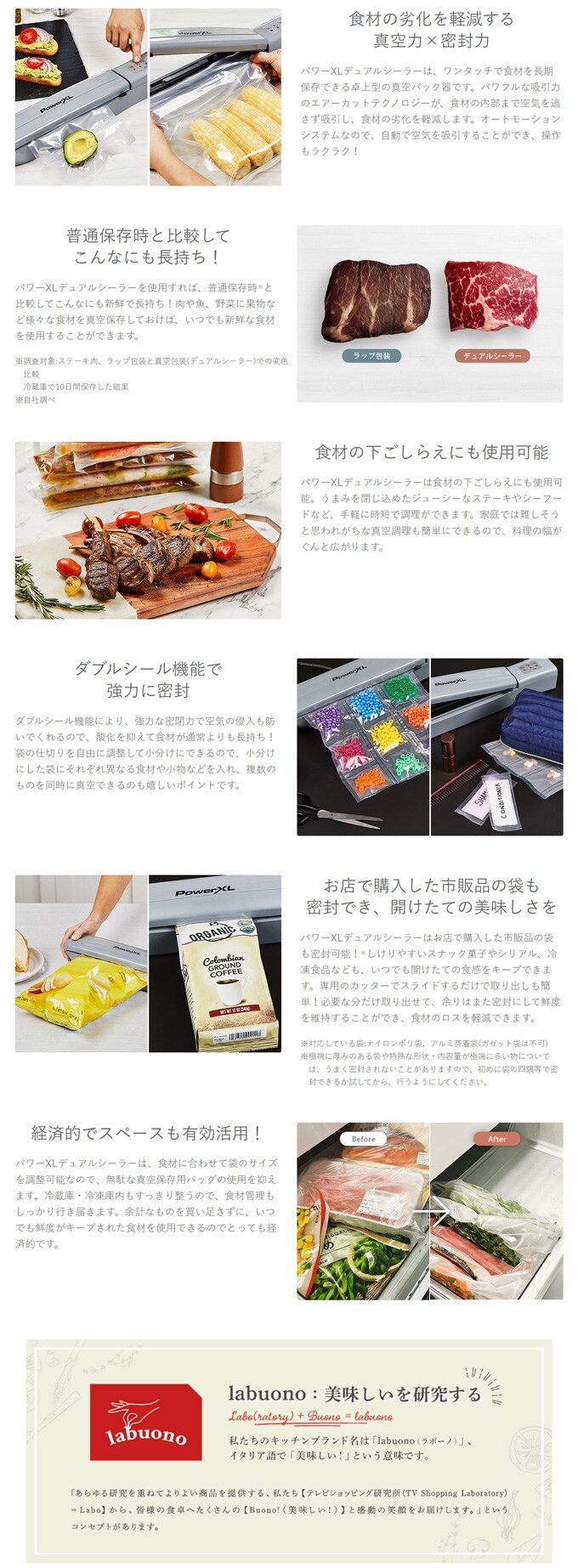 パワーXLデュアルシーラーは、うまみや栄養素、新鮮な状態を長期間キープしてくれる卓上型の真空パック器です。ご家庭内での食べ残し・手つかず食品を真空にすることで、保存期間を延ばし食品ロスの軽減や無駄な出費を抑えてくれます。パワフルな吸引力で、食材の内部まで空気を逃さず吸引!専用の真空保存用バッグやジッパー付き真空保存用バッグ以外にも、スナック菓子や冷凍食品などの市販袋も密封することができ、真空調理や個包装にもピッタリです。※