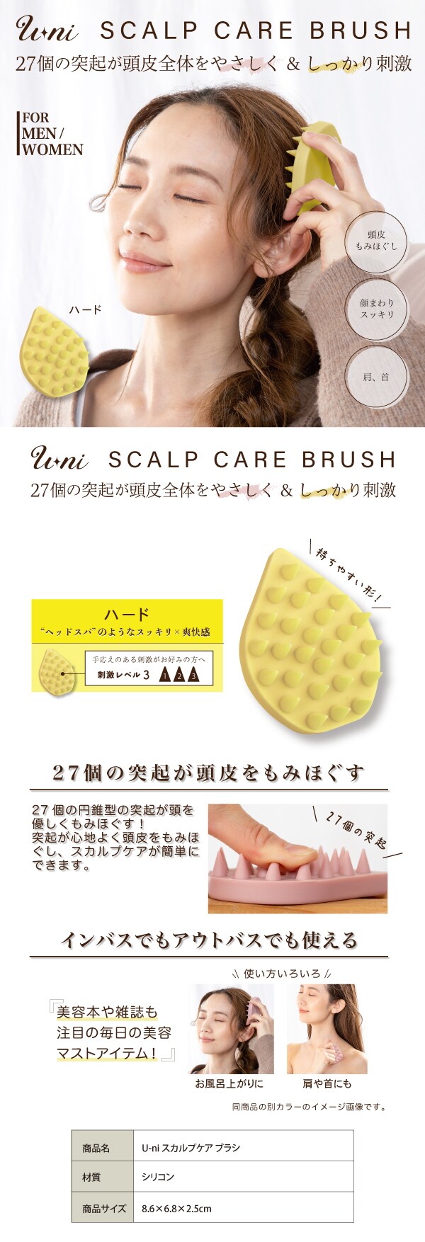 【ハードタイプ/イエロー】U-niスカルプヘアブラシ | 27個の突起が頭皮全体を優しく&しっかり刺激!お風呂の中でも使える♪