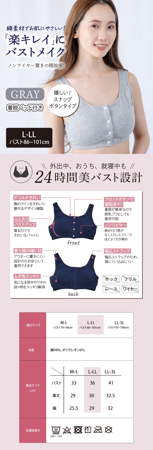 【L-LL/グレー】綿混こだわりの前あきブラ | 外出中、おうち、就寝中も24時間美バスト設計