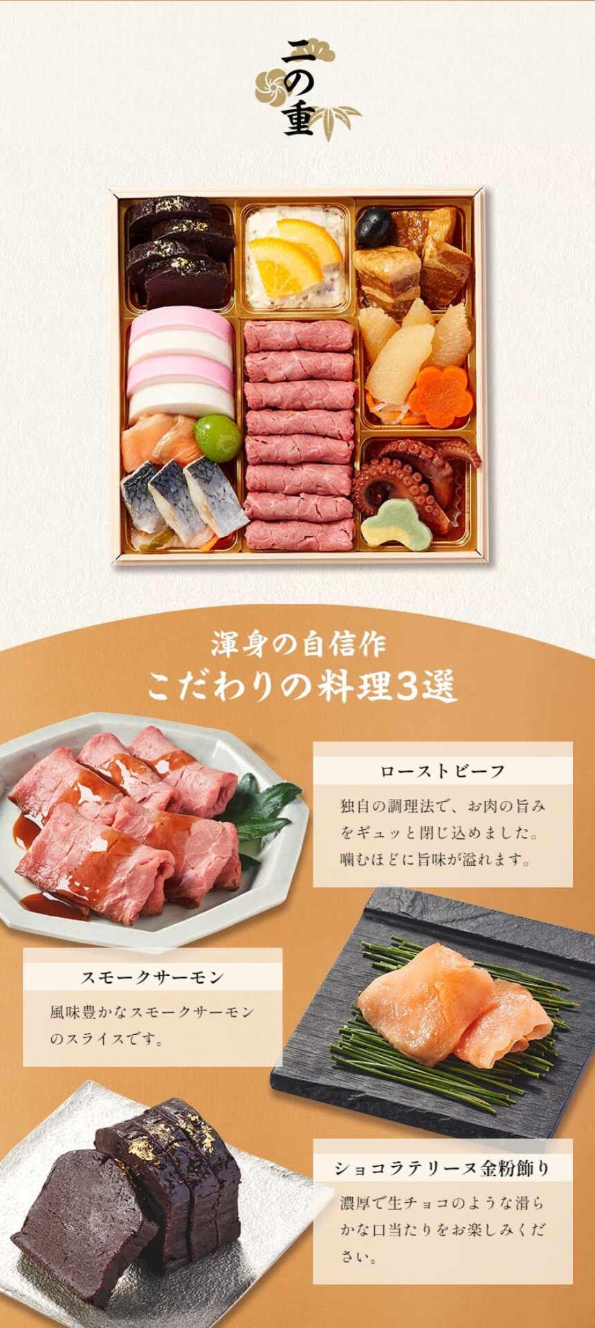 笹餅こしあん,きんかんさわやか煮,ほたて煮,寿高野,伊達巻,海老旨煮,味付焼筍,黒豆煮金粉飾り,カレイ西京焼,梅麩甘露煮,紅はるか栗きんとん,焼き湯葉巻,鶏肉三色巻,手まり麩,ショコラテリーヌ金粉飾り,蒲鉾赤,蒲鉾白,彩野菜マリネ,にしん昆布〆,スモークサーモン,若桃甘露煮,クリームチーズとフルーツピールオレンジ添え,ローストビーフ,豚角煮,ライプオリーブ,紅白なます,味付数の子,梅人参旨煮,蛸照り焼き,松麩甘露煮